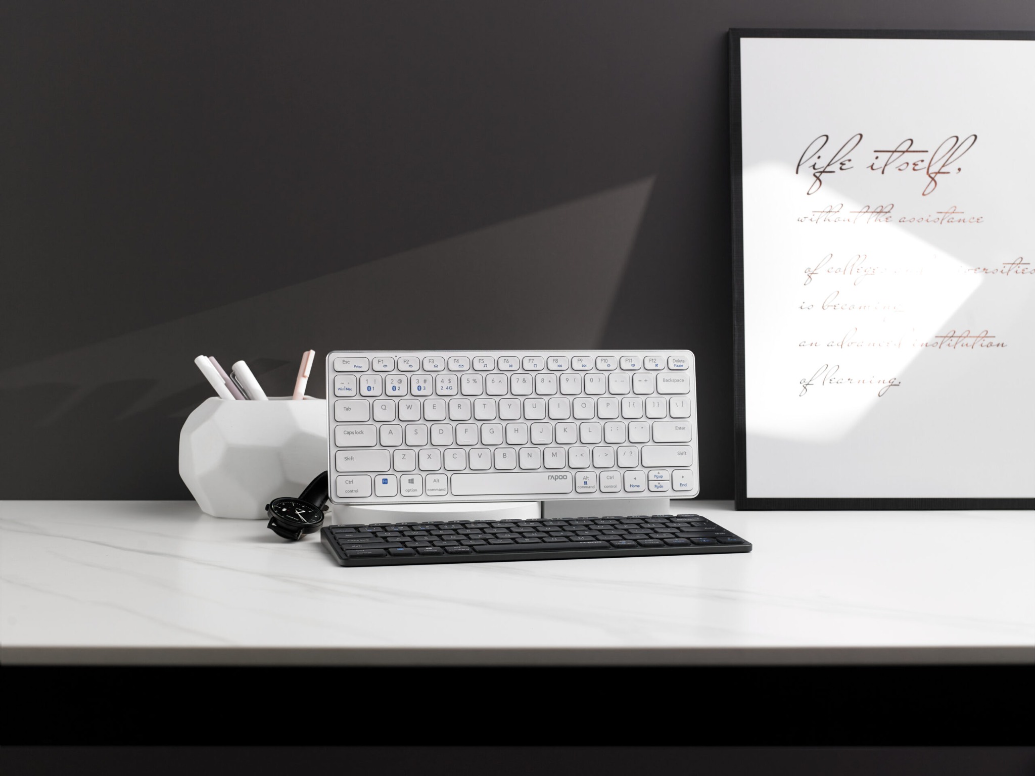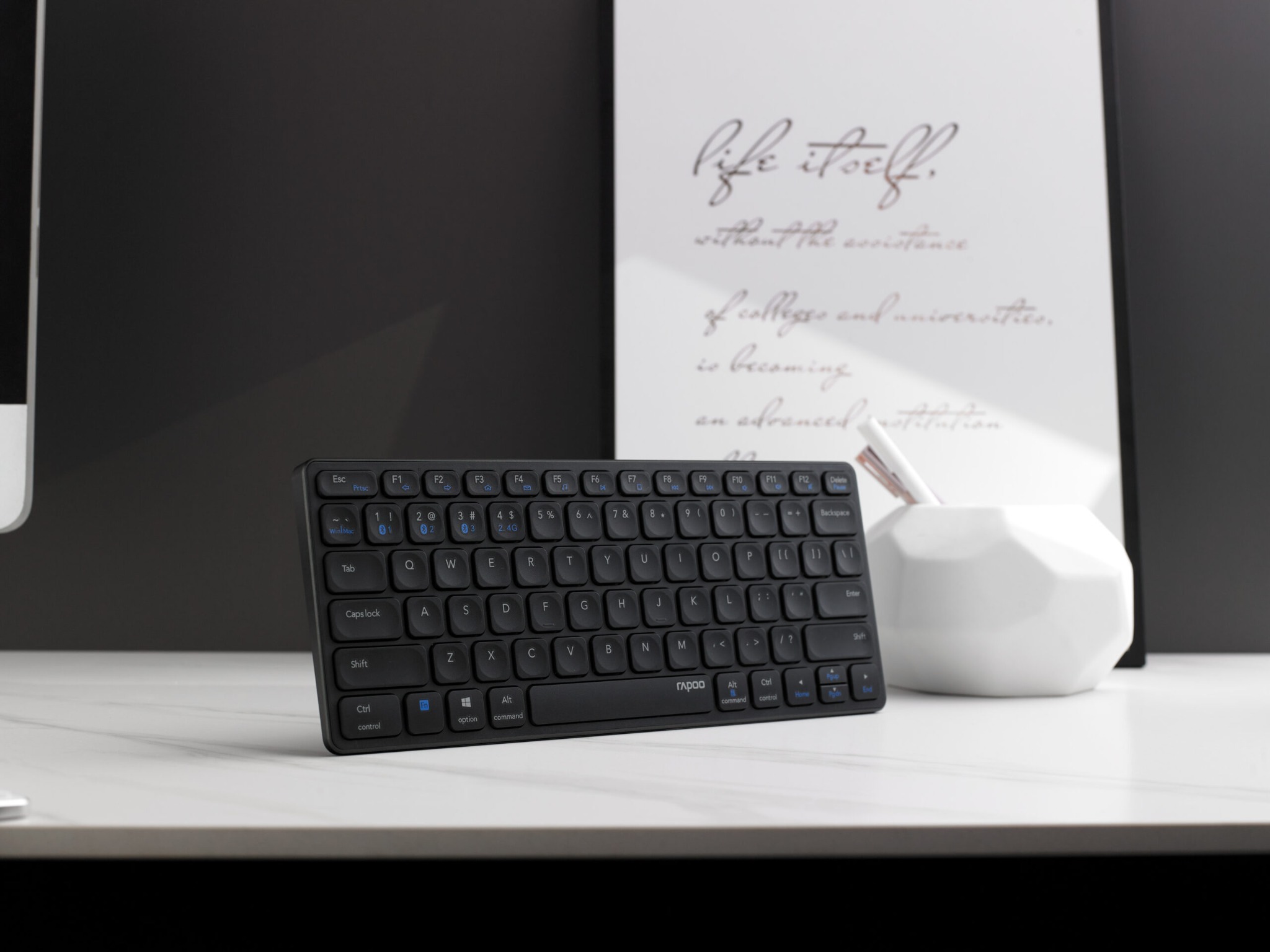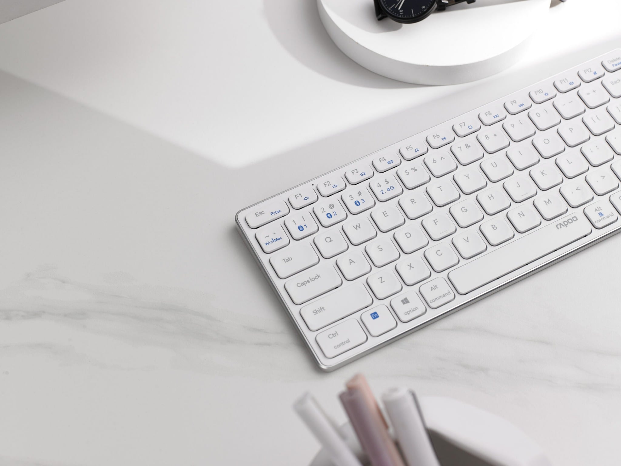 Bàn phím Rapoo không dây gọn kích thước gọn gàng, các cạnh bo viền mềm mại, phím bấm vuông vức tinh tế chất liệu nhựa bền tốt với chữ in laser nổi bật, không bị làm mờ khi sử dụng trong thời gian dài. Thiết kế bảo vệ an toàn tối ưu cho các bo mạch, không lo hư hại trong các tình huống vô tình làm tràn nước, để bạn thoải mái vừa làm việc vừa thưởng thức cà phê hay các thức uống yêu thích.