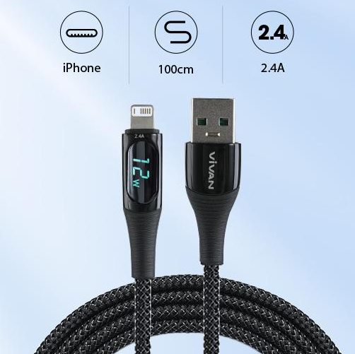 Cáp sạc Lightning - VIVAN VIL100 Black Chính hãng (Sạc nhanh, dây dù, hiển thị công suất, 2.4A, 1m)