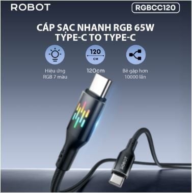Cáp sạc nhanh ROBOT Type C - Type C RGBCC120 65w