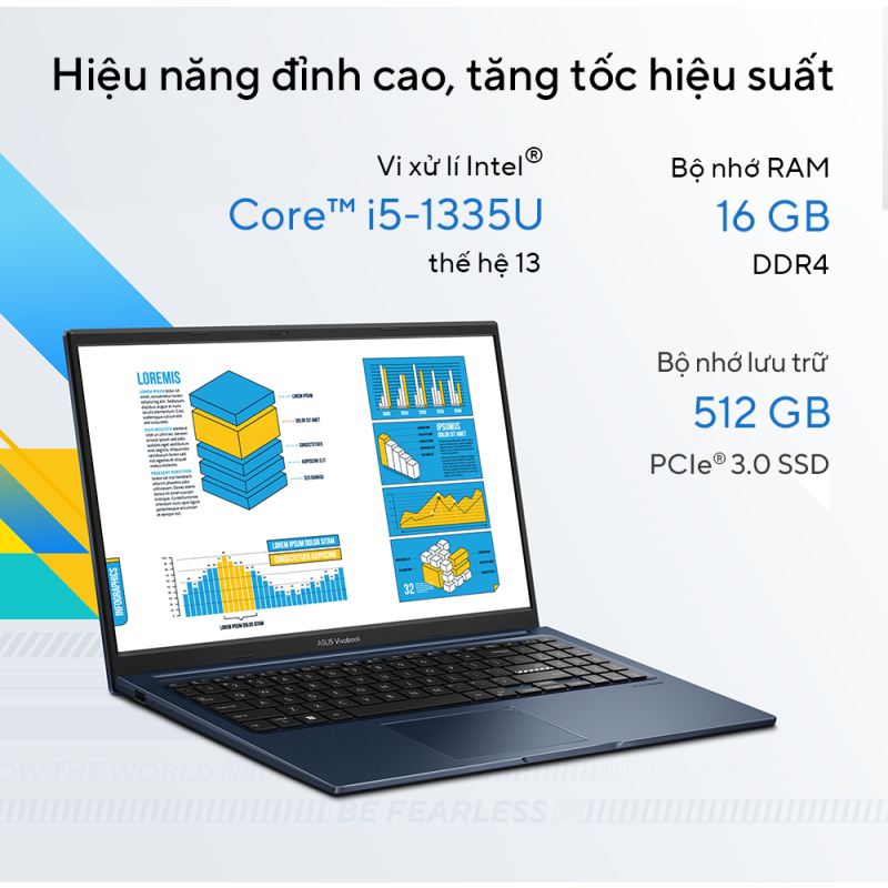 • Laptop Asus được trang bị bộ vi xử lý Intel Core i5 1335U thế hệ mới nhất của Intel với tốc độ xung nhịp tối đa lên đến 4.6 GHz, CPU đảm bảo hiệu suất mạnh mẽ để xử lý mượt mà các tác vụ văn phòng cũng như giải trí đa phương tiện.