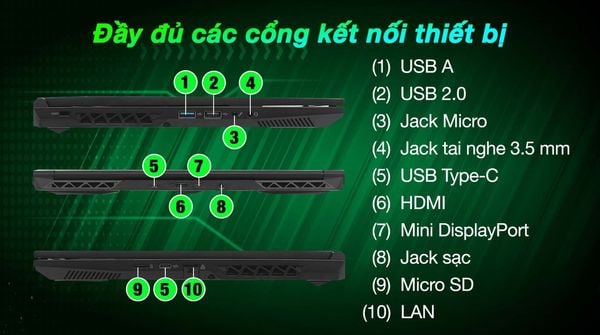 | Cổng giao tiếp | 1 x USB 2.0 Jack tai nghe 3.5 mm 1 x USB AJack Micro 2 x USB Type-C (hỗ trợ DisplayPort) LAN (RJ45) HDMI 2.1 Mini DisplayPort |